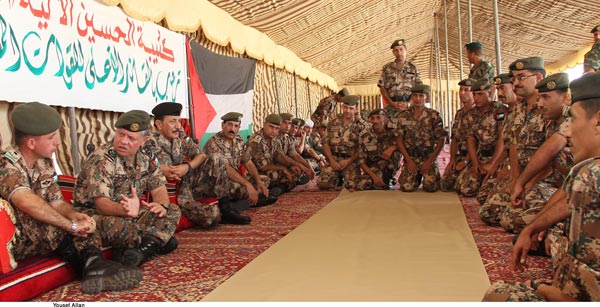 بعد ذلك تابع جلالته زيارته الى كتيبة الحسين الالية الثانية "ام الشهداء "حيث استمع من قائدها الى شرح عن واجباتها وبرامجها التدريبية ثم شاهد تمرينا تعبويا يمثل قتالا في المناطق المبنية نفذته الكتيبة عكس المستوى التدريبي المتميز الذي وصلت اليه في مهارات الميدان ودقة الاصابات ومستوى التنسيق بين القادة على مختلف مستوياتهم القيادية.(بترا)