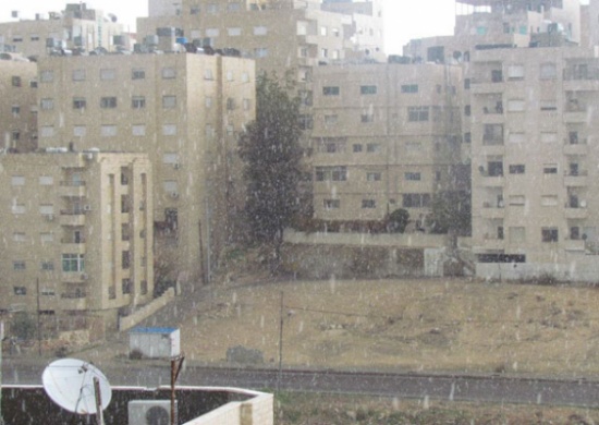 الاردنيون لمسوا ليلة الخميس - الجمعة دخول الجبهة الهوائية الباردة ، حيث استمر هبوب رياح شديدة تجاوزت سرعة الهبات المرافقة لها 100 كم/ساعة كما وبدأت الأمطار بالهطول ليلاً في شمال المملكة امتدت تدريجياً في ساعات ما بعد منتصف الليل لتشمل معظم المناطق الوسطى ، حيث تحولت الأجواء في تلك المناطق الى عاصفة وماطرة كما تساقط البرد على فترات وبكثافة مما ادى الى بعض التراكمات الخفيفة ، كما وشهدت المرتفعات الجبلية العالية في شمال ووسط المملكة تساقطاً خفيفاً للثلوج مترافقاً مع الأمطار مثل مرتفعات رأس منيف والقاعدة وصخرة في شمال المملكة وتلاع العلي ومرتفعات صويلح في العاصمة عمان.
