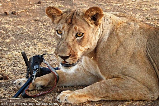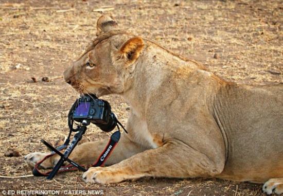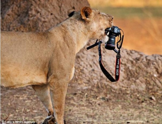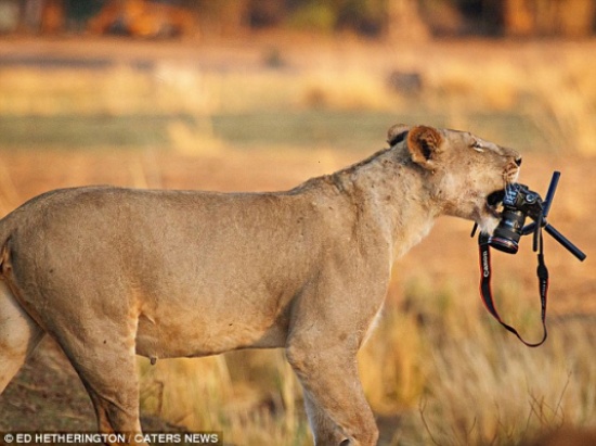 فبدلاً من أن تقترب اللبؤة من الفريسة لتأكلها أصبحت مهتمة بالكاميرا، حتى أنها التقطتها من على الحامل الثلاثي، وسارت بها حول الحديقة الوطنية في زيمبابوي، وراحت تلتقط بها الصور لفريستها ولنفسها،