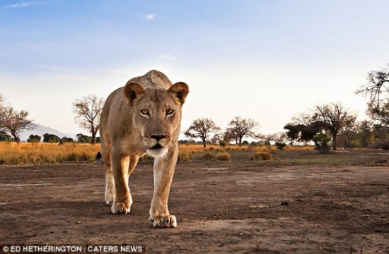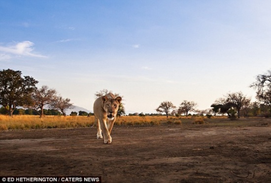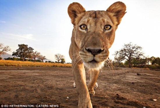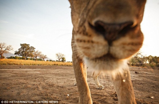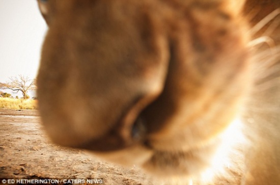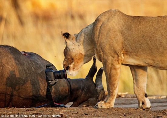 وقالت صحيفة "الديلي ميل" البريطانية: يحافظ مصورو الحياة الطبيعية على مسافة آمنة بينهم وبين الحيوانات أثناء التصوير، خاصة القاتلة منها، لكن المصور الأمريكي إد هيثرنجتون لم يقترب فقط من لبؤة جائعة، بل وضع الكاميرا بجوار جثة جاموس وحشي قتلتها اللبؤة، وكانت تستعد لالتهامها، على أمل أن يحصل على صور لها وهي تلتهم الفريسة، لكن النتيجة جاءت مذهلة.