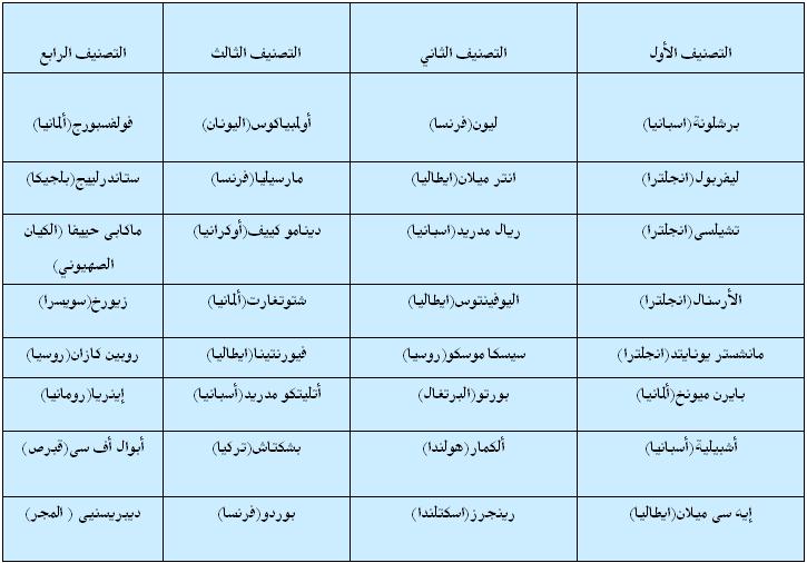 المدينة نيوز - فى الساعة السابعة مساء الخميس فى مونتى كارلو سيتم تقسيم 32 فريق أوروبي تأهلوا لدور الـ 32 من دوري أبطال أوروبا 2009/2010 إلى ثمانية مجموعات وتضم كل مجموعة أربعة فرق و سيتم أجراء القرعة لتوزيع المجموعات الثمانية حسب مستويات كل فريق وتصنيفاته و لا يمكن أن يقع فريقين من دولة واحدة فى الدور الأول و كذلك لا يمكن وقوع فريقين من تصنيف واحد فى الدور الأول حيث ستضم كل مجموعة فريق من التصنيف الأول وفريق من التصنيف الثاني وفريق من التصنيف الثالث وفريق من التصنيف الرابع و إليكم التصنيفات الأربعة :