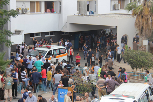 اهالي امام المستشفى بعد فرارهم من بيوتهم :