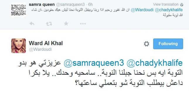 وعندما تدخلت إحدى المغريدات على الحديث، معتبرةً أن كل شخص يخطىء وعلينا أن لا نحقد عليه، إذ ورد في تغريدتها: "إن الله غفور رحيم إذا ربنا وبيقبل التوبة نحنا ليش هيك حقودين، إن شاء الله توبة مقبولة"، فكان رد ورد الخال قاسياً حيث كتبت في تغريدة: "عزيزتي هو بدو التوبة إيه بس نحنا جبلنا النوبة.. سامحيه وحدك.. يلا بكرا داعش بيطلب التوبة شو بتعملي ساعتها؟"، لتعلن بعدها ورد أنها لا تريد على حسابها في "تويتر" أي شخص يحب فضل شاكر.