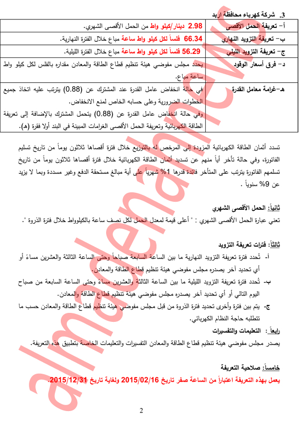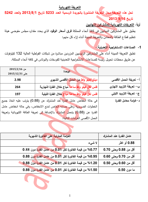 اعلن رئيس مجلس مفوضي هيئة تنظيم قطاع الطاقة والمعادن المهندس فاروق الحياري اليوم الاحد عن تفاصيل التعرفة الكهربائية الجديدة التي أصدرتها الهيئة والمعمول بها اعتبارا من السادس عشر من شهر شباط الماضي وحتى نهاية شهر كانون الاول المقبل.