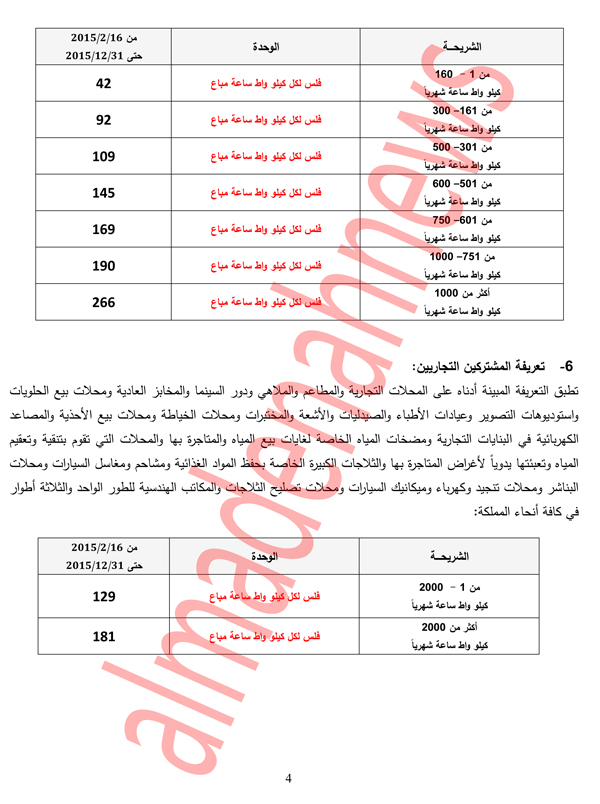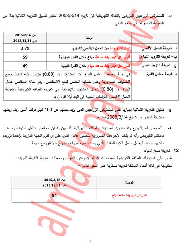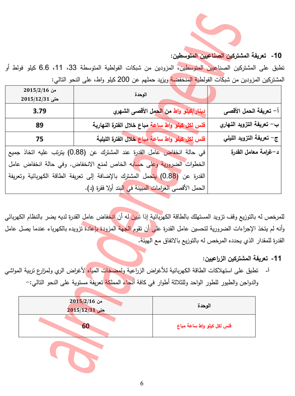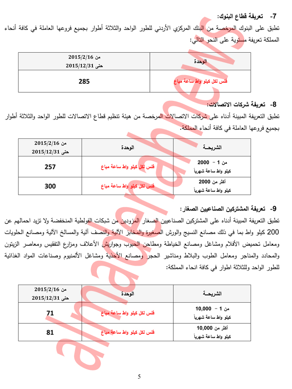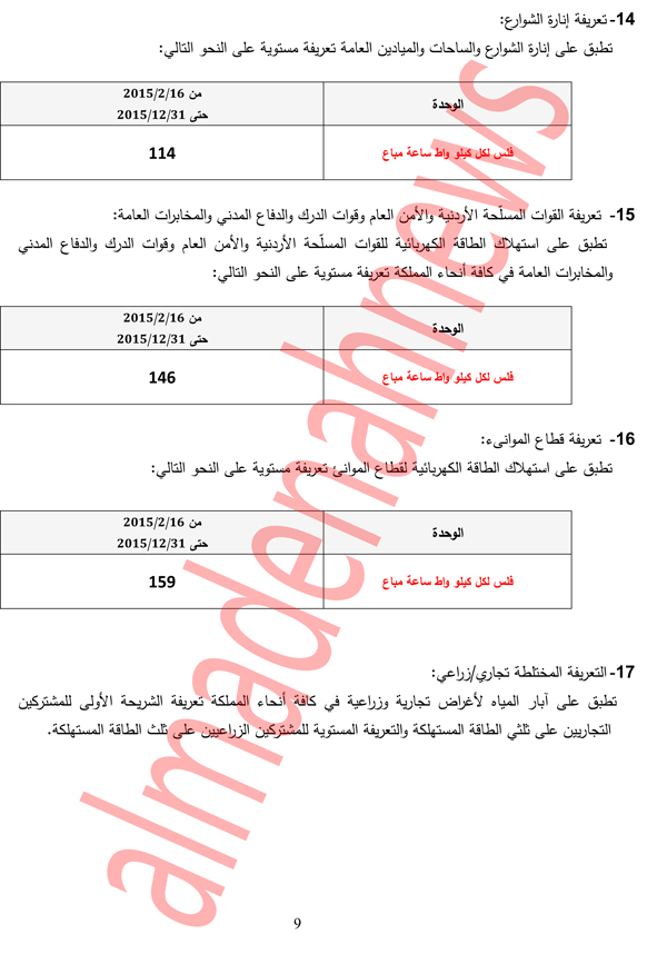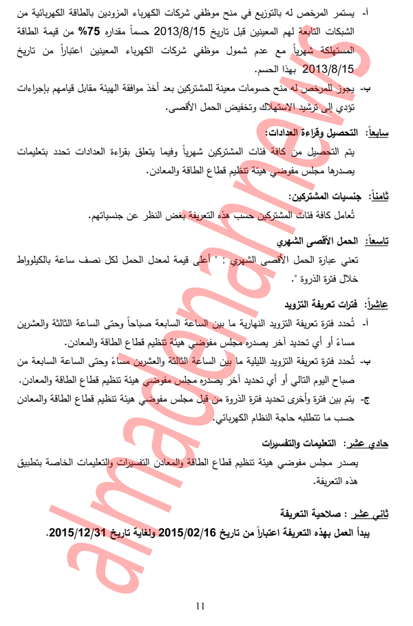 وقال في تصريح صحافي ان التعرفة التي جاءت بناءً على قرار مجلس الوزراء تتضمن رفع التعرفة الكهربائية بنسب زيادة تتراوح بين صفر و5ر7 بالمئة بدلا من النسبة التي تم اعتمادها سابقا وتراوحت بنسب زيادة بين صفر و 15 بالمئة.