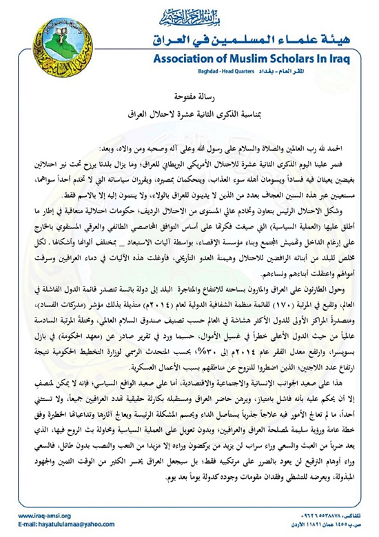 وذكرت الهيئة في رسالة مفتوحة للشعب العراقي الخميس بمناسبة الذكرى الثانية عشرة لاحتلال العراق ان البلد لايزال يرزح تحت نير احتلالين بغيضين يعيثان فيه فساداً ويسومان أهله سوء العذاب، ويتحكمان بمصيره، ويقرران سياساته التي لا تخدم أحداً سواهما، مستعينين عبر هذه السنين العجاف بحكومات احتلالية متعاقبة في إطار ما أطلق عليها (العملية السياسية) التي صيغت فكرتها على أساس التوافق المحاصصي الطائفي والعرقي المستقوي بالخارج على إرغام الداخل وتهميش المجتمع وبناء مؤسسة الإقصاء، بواسطة آليات الاستبعاد التي اوغلت في دماء العراقيين وسرقت أموالهم واعتقلت أبناءهم ونساءهم.