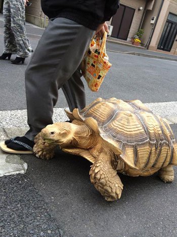 العجوز بجوار سلحفاته ووفقا لما نشر فى موقع boredpanda اللتوانى، فإن عددا من سكان طوكيو قالوا إنهم شاهدوا مؤخرا هذا الرجل المسن يسير مع سلحفاته بشكل دورى فى جولة حول المدينة متجاهلا البطء الذى تسير عليه، فهو يتقدمها فقط بخطوات بسيطة وهى تتبعه إلى أى مكان يذهب إليه. السلحفاة تسير خلف مالكها وحجم السلحفاة الكبير وطريقة سيرها بجوار الرجل المسن، دليل على أن هذا الزوج الغامض يعيشان فترة كبيرة معا، لدرجة أنها أحيانا ترتدى بعض القطع القماشية المشابهة لملابسه.