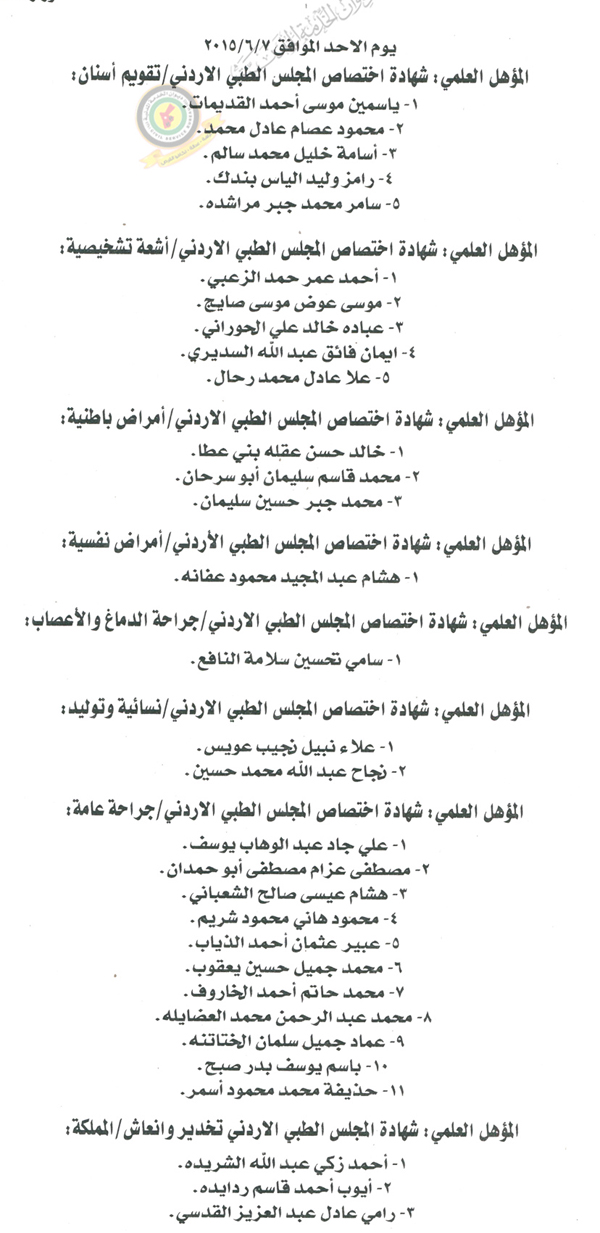 واشتملت تخصصات المرشحين في شهادة اختصاص المجلس الطبي الأردني / تقويم اسنان وشهادة اختصاص المجلس الطبي الأردني / أشعة تشخيصية وشهادة اختصاص المجلس الطبي الأردني / أمراض باطنية وشهادة اختصاص المجلس الطبي الأردني/ جراحة الدماغ والاعصاب / جراحة عامة وشهادة اختصاص المجلس الطبي الأردني /نسائية وتوليد وشهادة اختصاص المجلس الطبي الأردني / أمراض نفسية وشهادة المجلس الطبي الأردني تخدير وانعاش .