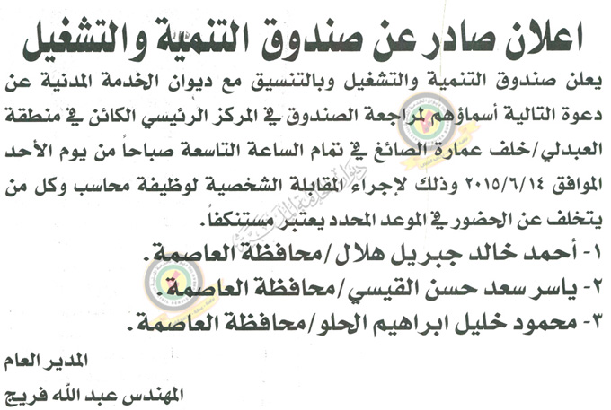 وطلب صندوق التنمية والتشغيل من المرشحين مراجعته في مركزه الرئيسي الكائن في منطقة العبدلي خلف عمارة الصائغ في تمام الساعة التاسعة صباحا من يوم الأحد القادم لإجراء المقابلة الشخصية لوظيفة محاسب، لافتا إلى أن كل من يتخلف عن الحضور يعتبر مستنكفا .