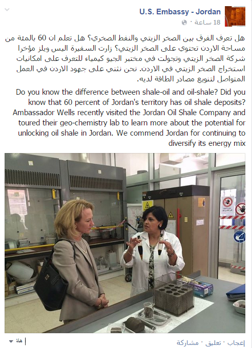وتساءلت السفارة في ذات المنشور : " هل تعرف الفرق بين الصخر الزيتي والنفط الصخري؟ هل تعلم ان 60 بالمئة من مساحة الاردن تحتوي على الصخر الزيتي؟ " .