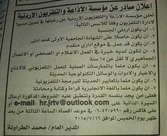 التلفزيون الاردني يعلن عن طلب تعيين مدير