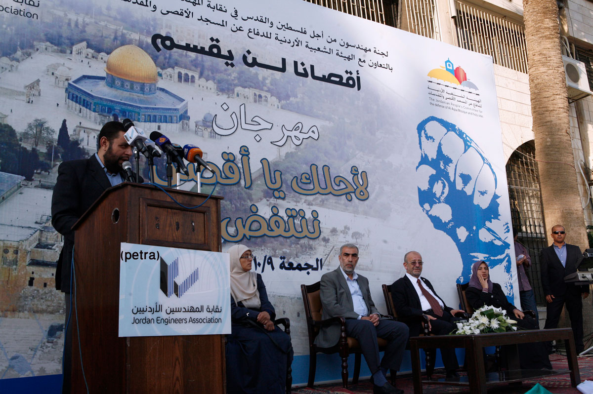 جاء ذلك خلال مهرجان بعنوان "لاجلك يا اقصى ننتفض" الذي نظمته لجنة "مهندسون من اجل فلسطين والقدس" في نقابة المهندسين الاردنيين بالتعاون مع الهيئة الشعبية الاردنية للدفاع عن المسجد الاقصى والمقدسات في ساحة مجمع النقابات المهنية .