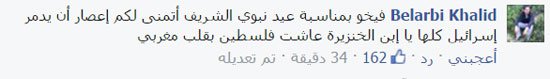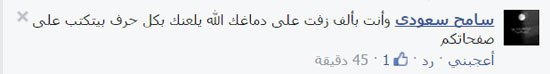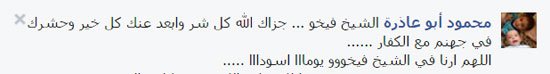 وقال إيموس محمد: "وأنت مالك يا معفن بالمولد أنت عدو الإسلام.. هو اللى يقتل الأطفال والصغار لا دين له". أما سامح سعودى فقال له: "وأنت بألف زفت على دماغك.. الله يلعنك بكل حرف بيتكتب على صفحاتكم"، وهو ما أكده سعيد": "يخرب بيتك يافخفخ كل مناسبة تهنينا ونفس اللحظة تقتل اخواننا الفلسطينيين.. إسرائيل دولة مجرمة".