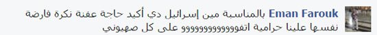 أما ماجى وائل فقالت: "مهما عملت أفخاى الكلب هتفضل فى نظرنا ونظر كل العرب سفاحين وإرهاب دماء.. والدليل أنك بترسم الدور علينا أنكم لسا زى مانتو محتلين وناهبين خير شعب ومغتصبين أرضه وسفك الدماء أطفال على شيوخ على نساء على شباب.. متتعبش نفسك العرب مش أغبياء ليكونوا معاك ويرحبوا بيك"، فيما دونت إيمان فاروق قائلة: "بالمناسبة مين إسرائيل دى.. أكيد حاجة عفنة نكرة فارضة نفسها علينا حرامية.. اتفوو على كل صهيونى".