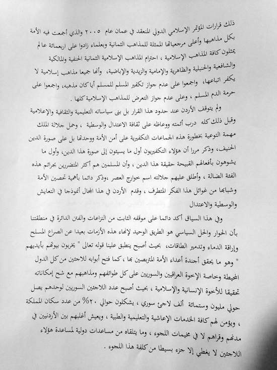 وبهذه المناسبة أحب أن أؤكد لكم أننا في الاردن قد حسمنا موقفنا بشكل واضح لا لبس فيه من قضية وحدة الامة والنأي بها عن مسألة الصراع الطائفي والمذهبي، وأننا أول من نبّه الى خطورة هذه النزاعات المذهبية والطائفية وذلك في الرسالة التي أطلقها عميد آل البيت جلالة الملك عبدالله الثاني ابن الحسين فيما يعرف برسالة عمان عام 2004م، ثم بعد ذلك قرارات المؤتمر الاسلامي الدولي المنعقد في عمان عام 2005 والذي اجمعت فيه الامة بكل مذاهبها وأعلى مرجعياتها الممثلة للمذاهب الثمانية وبعلماء زادوا على اربعمائة عالم يمثلون كافة المذاهب الاسلامية، احترام المذاهب الاسلامية الثمانية الحنفية والمالكية والشافعية والحنبلية والظاهرية والامامية والزيدية والاباضية، وانما جميعها مذاهب اسلامية لا يكفر اتباعها، واجمعوا على عدم جواز تكفير المسلم للمسلم أيا كان مذهبه، واجمعوا على حرمة الدم المسلم، وعلى عدم جواز التعرض للمذاهب الاسلامية كلها .