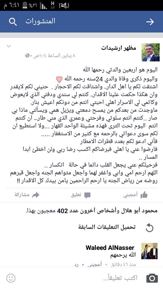 المدينة نيوز :- توفى الناشط الحراكي في إربد، مظهر ارشيدات، اليوم الأحد، بعد يومين من كتابته "بوست" على صفحته في "فيسبوك" يعرب فيه عن اشتياقه لوالديه المتوفيين.