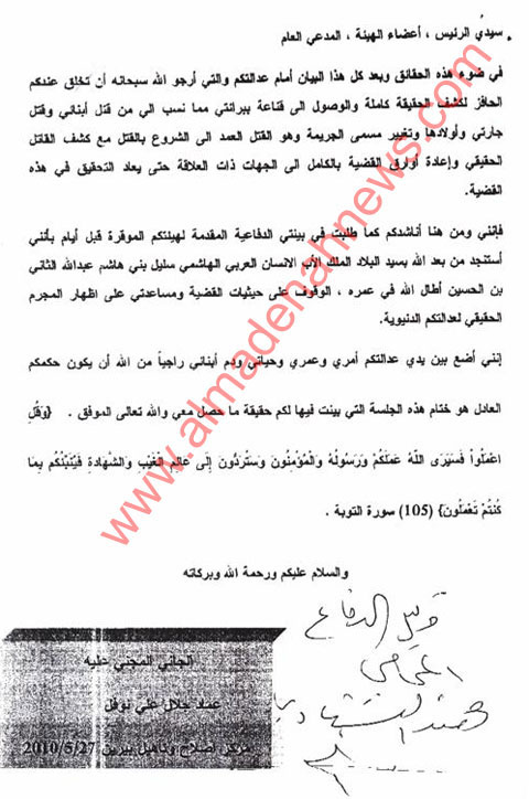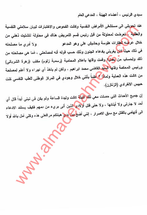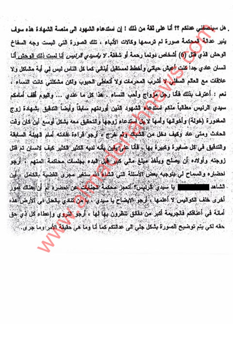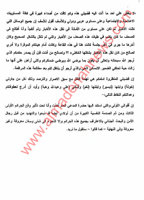 وكانت المدينة نيوز في وقت سابق قد انفردت بنشر افادة المتهم التي كتبها في مركز الاصلاح والتأهيل بخط يده في الشهر الماضي .