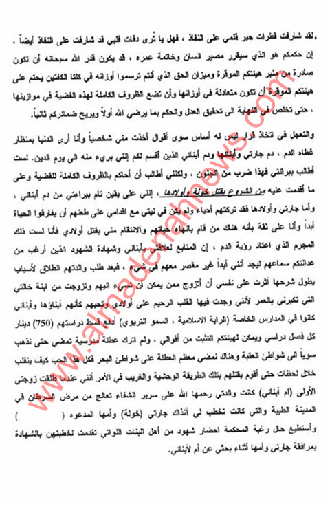 في الجلسة التي عقدتها محكمة الجنايات الكبرى مؤخرا برئاسة القاضي الدكتور نايف السمارات رئيس المحكمة وعضوية كل من العضو الايمن القاضي رزق ابو الفول والعضو الايسر القاضي طلال العقرباوي ، فقد تلا المحامي مهند البشتاوي وكيل الدفاع المعين من قبل المحكمة المرافعة الخطية في اخر جلسة لهذه القضية ما قبل الحكم ، وقد حصلنا على اهم ما احتوته هذه المرافعة الدفاعية بالوثائق ، والملفت في هذه المرافعة ان المتهم قال ان هنالك من قام بالانتقام منه وانهاء حياة اطفاله الثلاثة ، وانه عندما طعن جارته وكلا من طفليها تركهم على قيد الحياة ، وطالب المحكمة تغيير وصف التهمة المسندة الية من جناية القتل العمد الى جناية الشروع بالقتل .