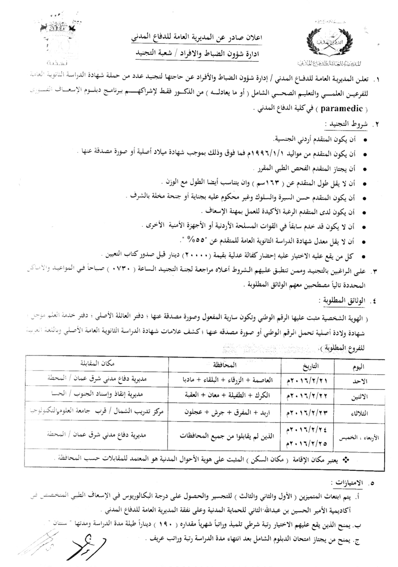 المدينة نيوز - : اعلنت المديرية العامة للدفاع المدني عن حاجتها لتجنيد عدد من حملة شهادة الثانوية العامة للفرعين العلمي والتعليم الصحي الشامل للذكورفقط لإشراكهم ببرنامج دبلوم الإسعاف الفوري (Paramedic) في كلية الدفاع المدني.