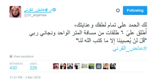 وقال القرني في تغريدة له على تويتر ، مساء الخميس : " اللهم لك الحمد على تمام لطفك وعنايتك ، أُطلق عليّ ٦ طلقات من مسافة المتر الواحد ونجاني ربي ، "قُلْ لنْ يُصِيبَنَا إِلا ما كتب الله لنَا" ".