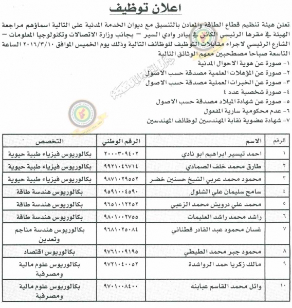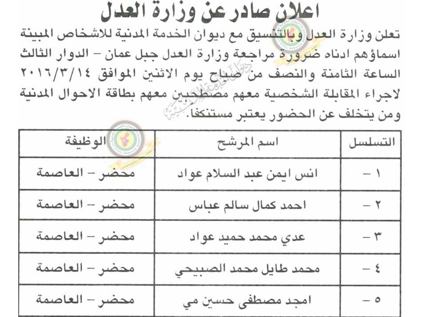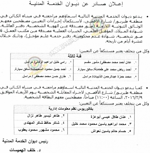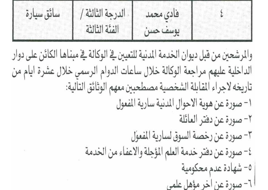 يدعو ديوان الخدمة المدنية بالتعاون مع مختلف الوزارات والمؤسسات الحكومية، التالية اسماؤهم لاجراء المقابلات الشخصية وعقد الامتحان التنافسي لغايات التعيين.