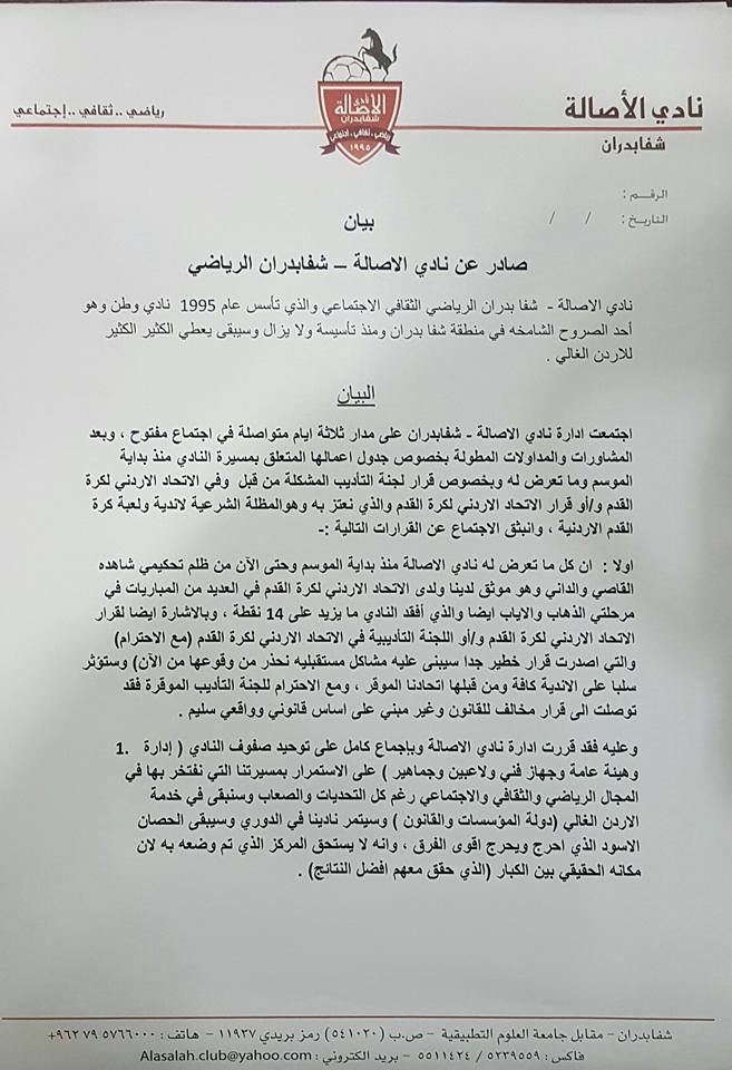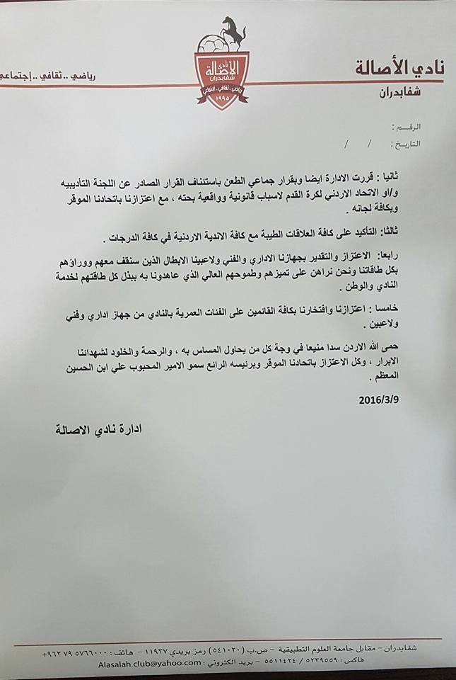 وكان اللجنة التأديبية وبناء على شكوى النادي الفيصلي اصدرت قرارا بتخسير الاصالة امام الفيصلي بنتيجة 0-3 في المباراة التي انتهت بالتعادل 1-1، حيث جاءت الشكوى من الفيصلي على اعتبار ان الاصالة اشرك لاعبا بشكل يخالف التعليمات.