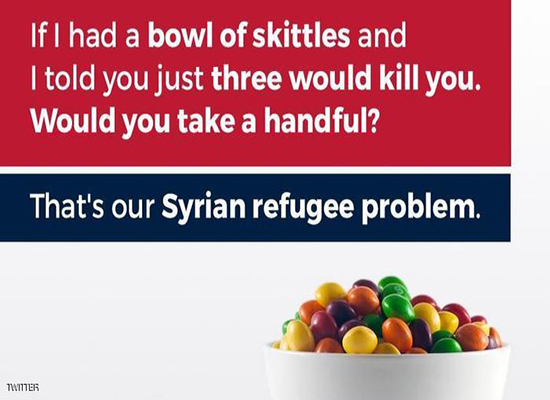 وكتب فوق الصورة: "لو كان لدي وعاء فيه سكيتلز وقلت لكم أن 3 منها فقط يمكن أن تؤدي إلى وفاتكم فهل ستتناولون منها؟ هذه هي مشكلتنا مع اللاجئين السوريين".