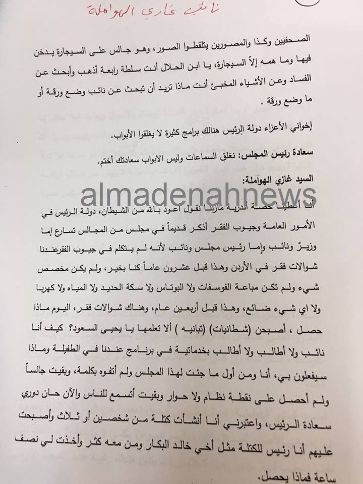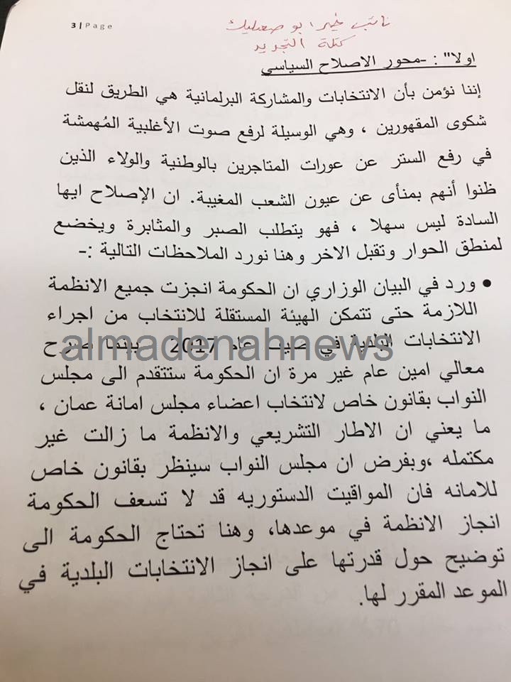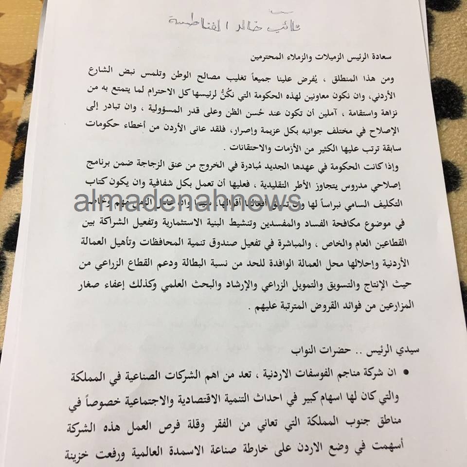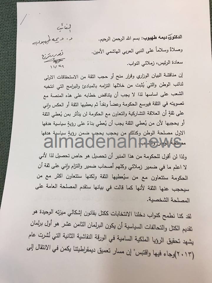 المدينة نيوز :- واصل مجلس النواب لليوم الثالث على التوالي, مناقشة البيان الوزاري للحكومة لطلب ثقة النواب على اساسه، في جلسته المسائية ليوم الثلاثاء برئاسة رئيس المجلس عاطف الطراونة، وحضور رئيس الوزراء الدكتور هاني الملقي وهيئة الوزارة.
