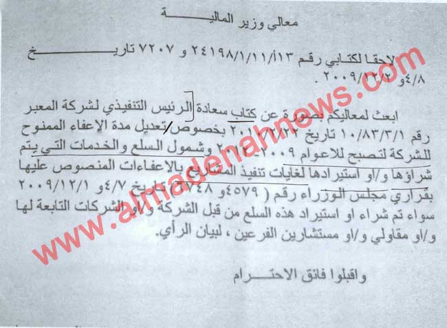المدينة نيوز - خاص وحصري وبالوثائق : اتكأ رئيس الوزراء سمير الرفاعي على وزير المالية محمد ابو حمور في اتخاذ خطوات مستهجنة تتعلق بتعديل مدد الاعفاء الممنوح لشركة المعبر وشمول كل السلع والخدمات بالاعفاءات سواء تم شراء او استيراد هذه السلع من قبل شركة المعبر مباشرة او الشركات التابعة لها او المقاولين والمستشارين .