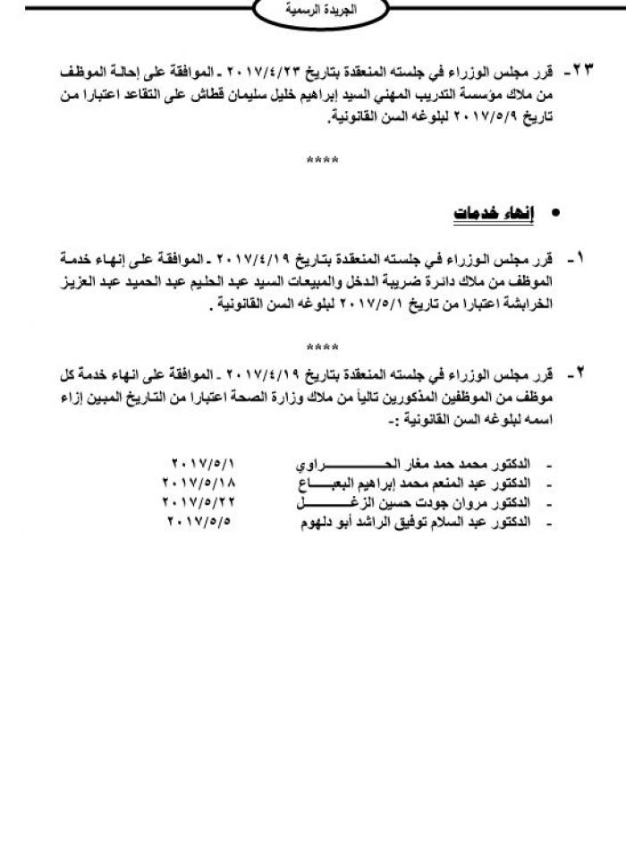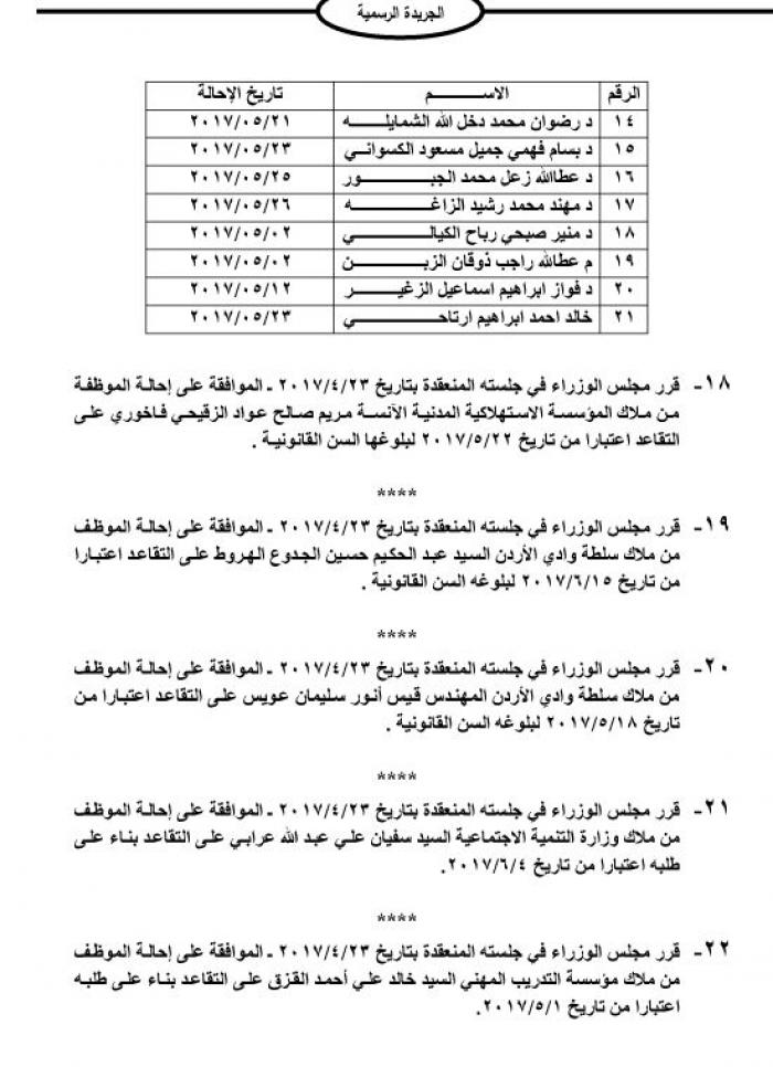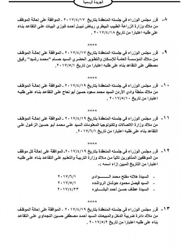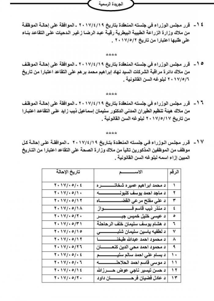 المدينة نيوز :- قرر مجلس الوزراء في جلسته الأخيرة الموافقة على احالة عدد من الموظفين في الوزارات والمؤسسات الحكومية إلى التقاعد .