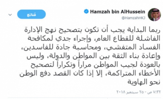 ونشر سموه تغريدة على موقع التواصل الاجتماعي تويتر قال فيها " ربما البداية يجب أن تكون بتصحيح نهج الإدارة الفاشلة للقطاع العام، وإجراء جدي لمكافحة الفساد المتفشي، ومحاسبة جادة للفاسدين، وإعادة بناء الثقة بين المواطن والدولة، وليس بالعودة لجيب المواطن مراراً وتكراراً لتصحيح الأخطاء المتراكمة، إلا إذا كان القصد دفع الوطن نحو الهاوية " .