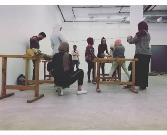 وكانت مشاركة الطلبة حاضرة بقوة في المعرض الدولي للمؤسسة من خلال ورشتي عمل الأولى تخصصت بالفن الجرافيكي بإشراف رئيس قسم الفنون البصرية الدكتور جهاد العامري، والثانية في تصميم مقاعد من وحي الدارة بإشراف الدكتورة هيفاء بني اسماعيل، حيث تم عرض الأعمال التي لاقت استحسان الحضور والمشاركين في استوديوهات الطباعة في دارة الفنون.