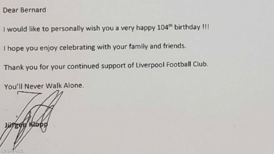 وقال كلوب في الرسالة الموقعة باسمه "عزيزي بيرنارد، أتمنى لك شخصيا عيد ميلاد سعيدا، أتمنى أن تستمتع بالاحتفال به مع عائلتك وأصدقائك.. شكرا على تشجيعك المستمر لليفربول.. لن تسير لوحدك أبدا".