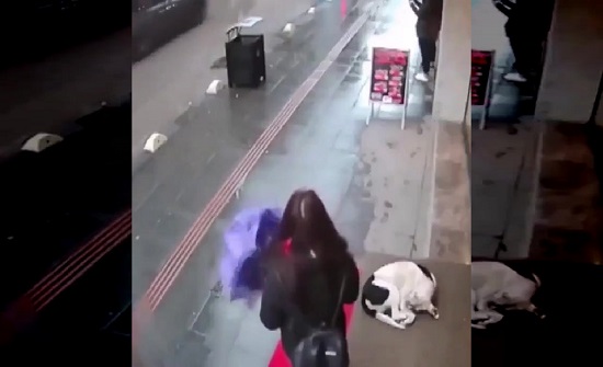 أظهر مقطع الفيديو الذي وثقته كاميرا المراقبة، لحظة خروج الفتاة من أحد المحال حيث رأت كلبا نائما في الشارع والطقس شديد البرودة، ثم رحلت وبعد ثوان عادت وظلت تنظر إليه بشدة.