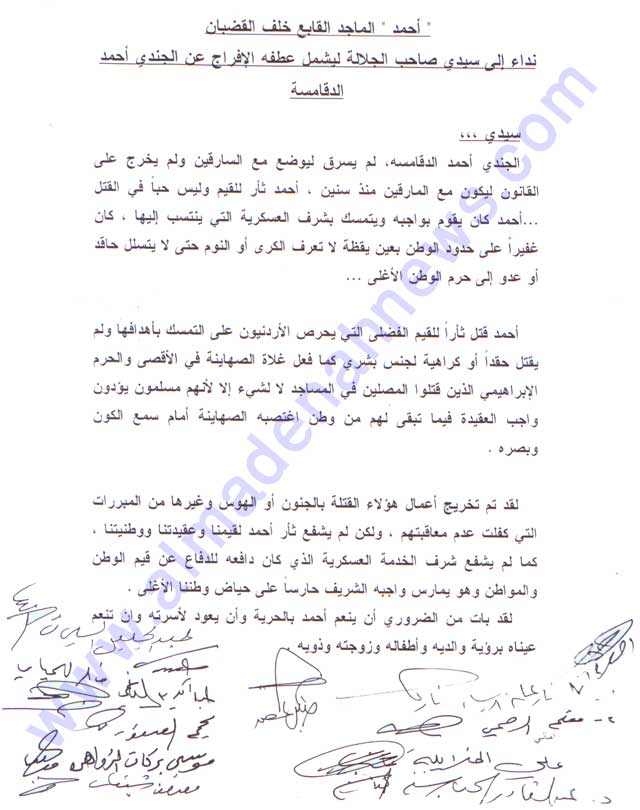 المدينة نيوز – خاص – وثائق - : طالب عشرات النواب بالإفراج عن الجندي أحمد الدقامسة من خلال نداء مكتوب رفعوه إلى جلالة الملك الأحد .