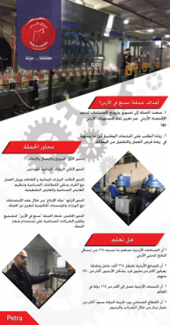 ويدعو مدير مجموعة مصانع في المفرق وعمان، المهندس هيثم مصطفى، الى تعزيز التوعية بين شبابنا بأهمية الصناعة الوطنية والتطورات التي حصلت عليها في السنوات الأخيرة، من خلال حملات التوعية في المدارس والجامعات، مؤكدا جودة المنتجات المحلية ومطابقتها لمواصفات مؤسسة المواصفات والمقاييس الأردنية وخضوعها لعدد من التحاليل المخبرية لدى جهات رقابية عدة . ووفقا لمؤشرات أداء الحملة فقد ارتفعت نسبة تغطية الاستهلاك المحلي من المنتجات الاردنية من نحو 6ر41 بالمئة عند بدء الحملة عام 2013 الى نحو 4ر45 بالمئة العام الماضي، إذ أن الهدف العام للحملة هو تعزيز ثقة المواطن بالصناعة الأردنية وزيادة الإقبال عليها. -- (بترا)