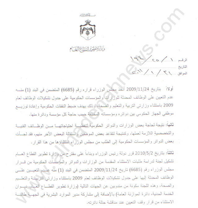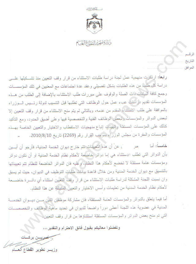 المدينة نيوز – خاص وحصري – وثائق – أقرأوا هذه الوثيقة التي حصلنا عليها والتي وقعت عليها نسرين بركات وزيرة تطوير القطاع العام السابقة بتاريخ 31 – 1- 2011 وبررت فيها لجهات رقابية لماذا يتم التعيين خارج ديوان الخدمة المدنية في ظل وجود آلاف العاطلين عن العمل ..