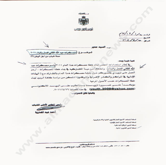 وإننا في المدينة نيوز نضع الوثيقة االتي تدحض ما قاله المصاروة أمام المسؤولين في الديوان الملكي العامر ، حيث خاطب بها المصاروة رئيس الوزراء يطلب بها استبدال معسكرات الحسين مع إصرار المصاروة وإنكاره بأنه لا توجد أي وثيقة حول ذلك. والأدهى من هذا انه خاطب مديريات الشباب بتاريخ 5-4-2011 أي قبل أن يخاطب رئيس الوزراء بـ21 يوما وذلك لاستئذان الديوان الملكي العامر وأيضا قبل ان يجيء الرد من الديوان الملكي العامر برفض ما جاء بكتابه شكلا ومضمونا