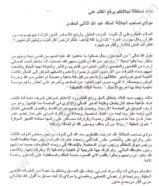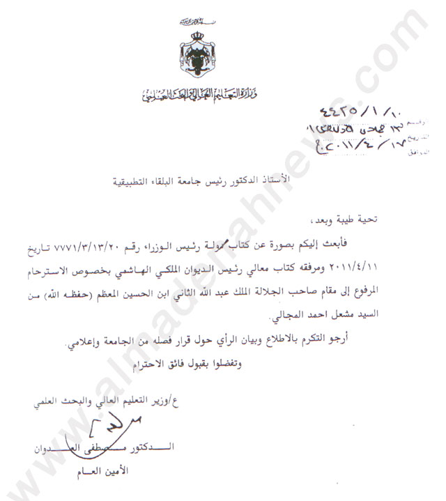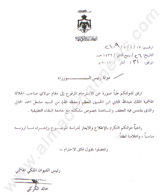 المدينة نيوز – خاص وحصري – وثائق – ينتظر أن يتم إتاحة الفرصة له لشرح قضيته بالتفصيل ، وها هو الموظف في جامعة البلقاء التطبيقية مشعل المجالي يلجأ إلى الملك عبر مخاطبات بعث بها مؤخرا إلى الديوان الملكي .