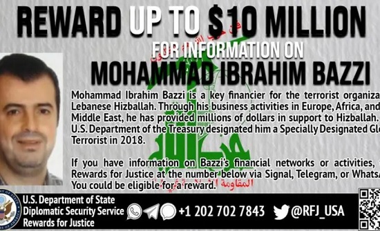 وكانت واشنطن قد رصدت مكافأة قدرها 10 ملايين دولار مقابل معلومات عن مكان تواجد بزي الذي ساهم بجمع ملايين الدولارات لصالح حزب الله على مدى سنوات.