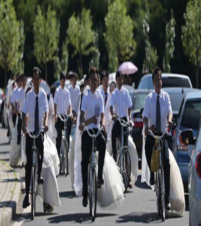 المدينة نيوز- ارتدى 60 زوج ثياب زفافهما للمشاركة في حفل زفاف جماعي أقيم على دراجات هوائية في بكين.