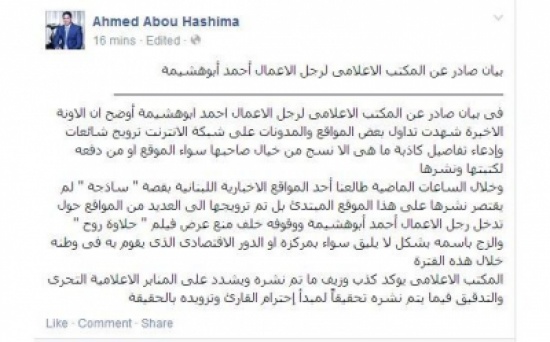 وأضاف البيان "طالعنا أحد المواقع الإخبارية اللبنانية بقصة " ساذجة " لم يقتصر نشرها على هذا الموقع "المبتدئ"، بل تم ترويجها إلى العديد من المواقع حول تدخل رجل الأعمال أحمد أبو هشيمة، ووقوفه خلف منع عرض فيلم " حلاوة روح " والزج بإسمه بشكل لا يليق سواء بمركزه أو الدور الإقتصادي الذي يقوم به في وطنه خلال هذه الفترة".