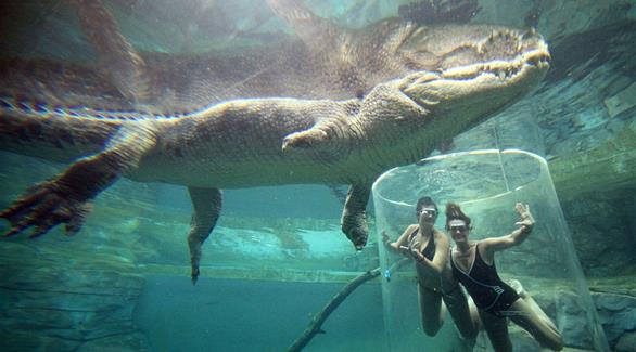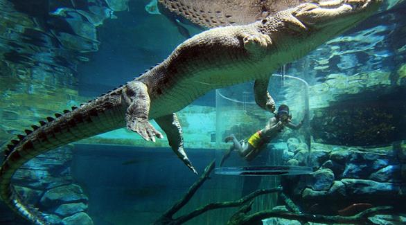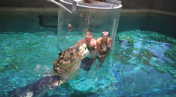 المدينة نيوز:- يقدم منتزه أسترالي تجربة فريدة لزواره من عشاق المغامرات الخطيرة، من خلال قفص زجاجي يمكنهم من السباحة إلى جانب تمساح مفترس، يصل طوله إلى 16 قدم والتقاط الصور التذكارية معه.