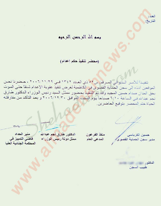وتنشر المدينة نيوز تاليا وثائق اعدام الرئيس فجر يوم الاضحى عام 2006 حيث وقع على قرار تنفيذ الاعدام رئيس الوزراء العراقي السابق نوري المالكي ، احد اقطاب حزب الدعوة الذي نشأ وتدرب ويمول من ايران ، وهو نفس الحزب الذي ينحذر منه رئيس الوزراء الحالي حيدر العبادي .