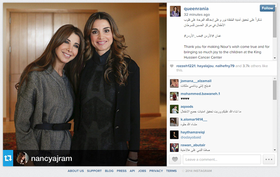 وعلقت الملكة على الصورة عبر حسابيها على موقعي انستجرام وتويتر بقولها : " شكراً على تحقيق أمنية الطفلة نور وعلى إدخالك الفرحة على قلوب اﻷطفال في مركز الحسين للسرطان " .