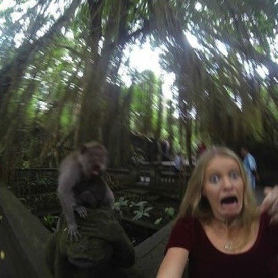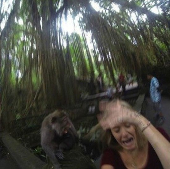 كما أن هناك آخرين يفضلون التقاط سيلفى بجانب الطبيعة الساحرة أو الحيوانات المختلفة، ولكن هناك بعض الحيوانات التى ترفض التقاط الصور بجانبها، وتمنع أى متطفل يريد أن يلتقط لها سيلفى دون رغبتها، وهذا ما حدث مع إحدى الفتيات الآتى كانت تزور حديقة الحيوانات وقررت التقاط سيلفى بجانب قرد، ولكنه بعد أن رفعت يدها لالتقاط الصورة قام بالهجوم عليها مما أثار رعبها. وذكر موقع metro البريطانى أن القرد كان غاضبا للغاية وتعبيرات وجهه التى ظهرت فى الصور التى تم التقاطها للحادث بالصدفة، تظهر مدى كرهه لصور السيلفى.