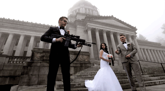 المدينة نيوز:- لفت عريس وعروسة، وهما بملابس الزفاف، انتباه الصحافة، بين حوالي ألف متظاهر بساحة أولمبيا بواشنطن، عندما قررا المشاركة في الاحتجاج ضد القانون الذي دخل حيز التنفيذ منذ 4 ديسمبر (كانون الأول) الجاري، والذي يسمح للسلطات قيل منح أي بائع سلاح أو مشتري، خلو صاحبة من أية مشاكل قانونية أو عقلية.