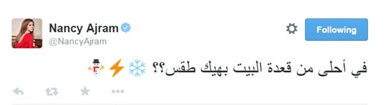 وكتبت نانسي تغريدة على "تويتر"، قائلة: "فيه أحلى من قعدة البيت بهيك الطقس؟؟".