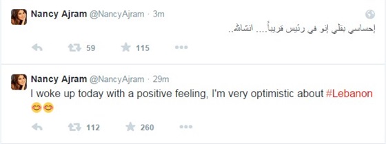 وكتبت نانسي تغريدة على "تويتر"، قالت فيها: "استيقظت اليوم بشعور إيجابي، أنا متفائلة جدًا فيما يخص لبنان.. إحساسي بيقولي إنه فيه رئيس قريبًا.... إن شاء الله".