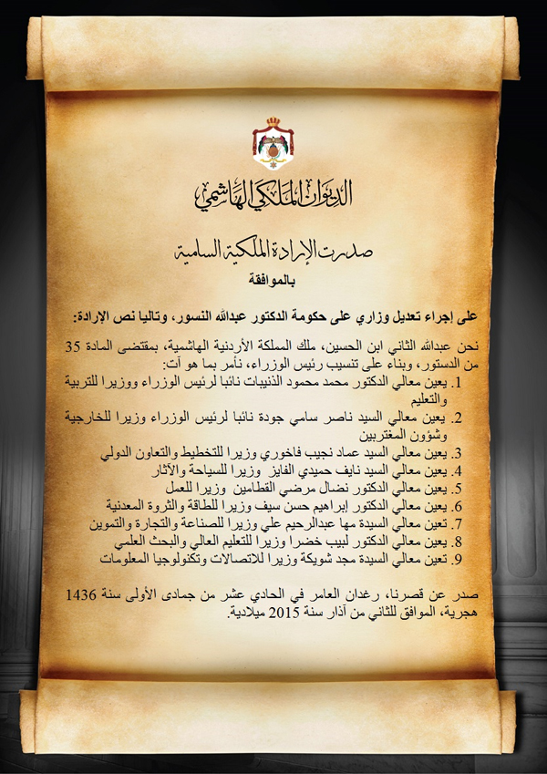 المدينة نيوز - صدرت الإرادة الملكية السامية، اليوم الاثنين، بالموافقة على إجراء تعديل على حكومة الدكتور عبدالله النسور، وتاليا نص الإرادة: "نحن عبدالله الثاني ابن الحسين، ملك المملكة الأردنية الهاشمية، بمقتضى المادة 35 من الدستور، وبناء على تنسيب رئيس الوزراء، نأمر بما هو آت: